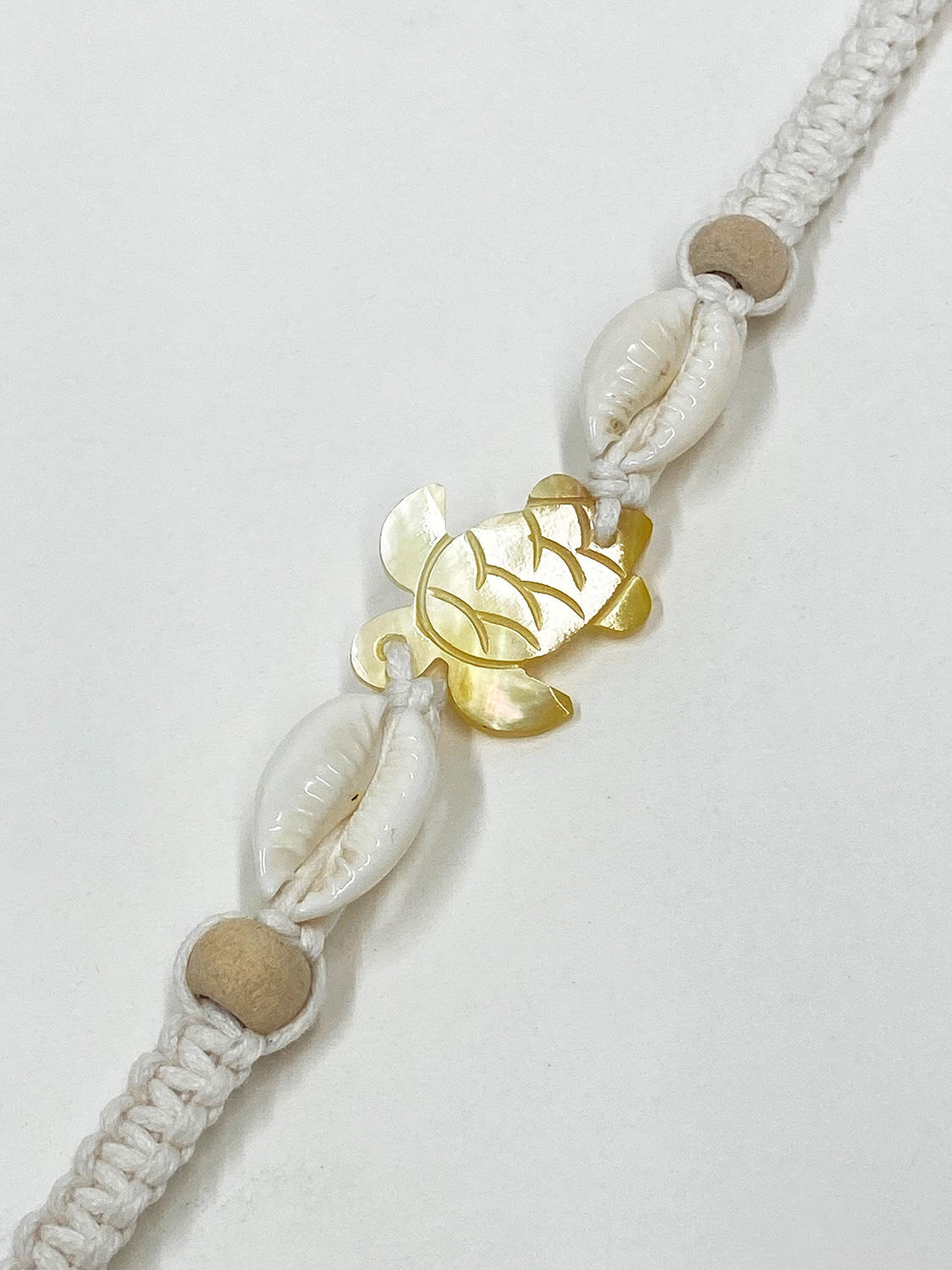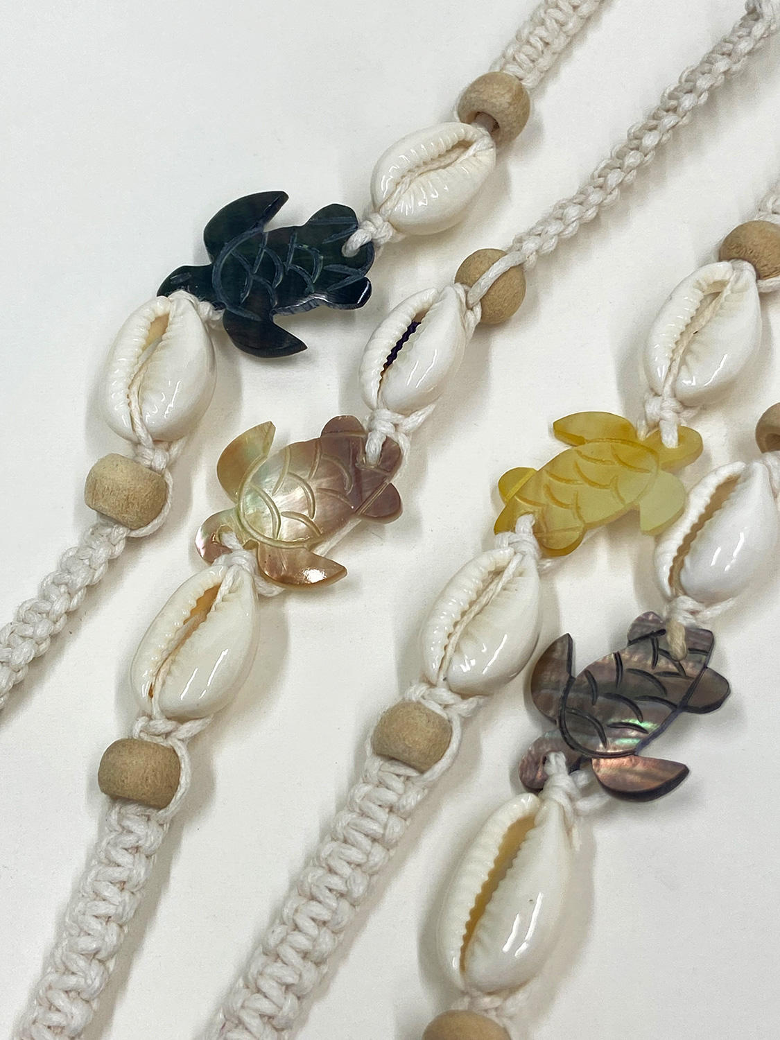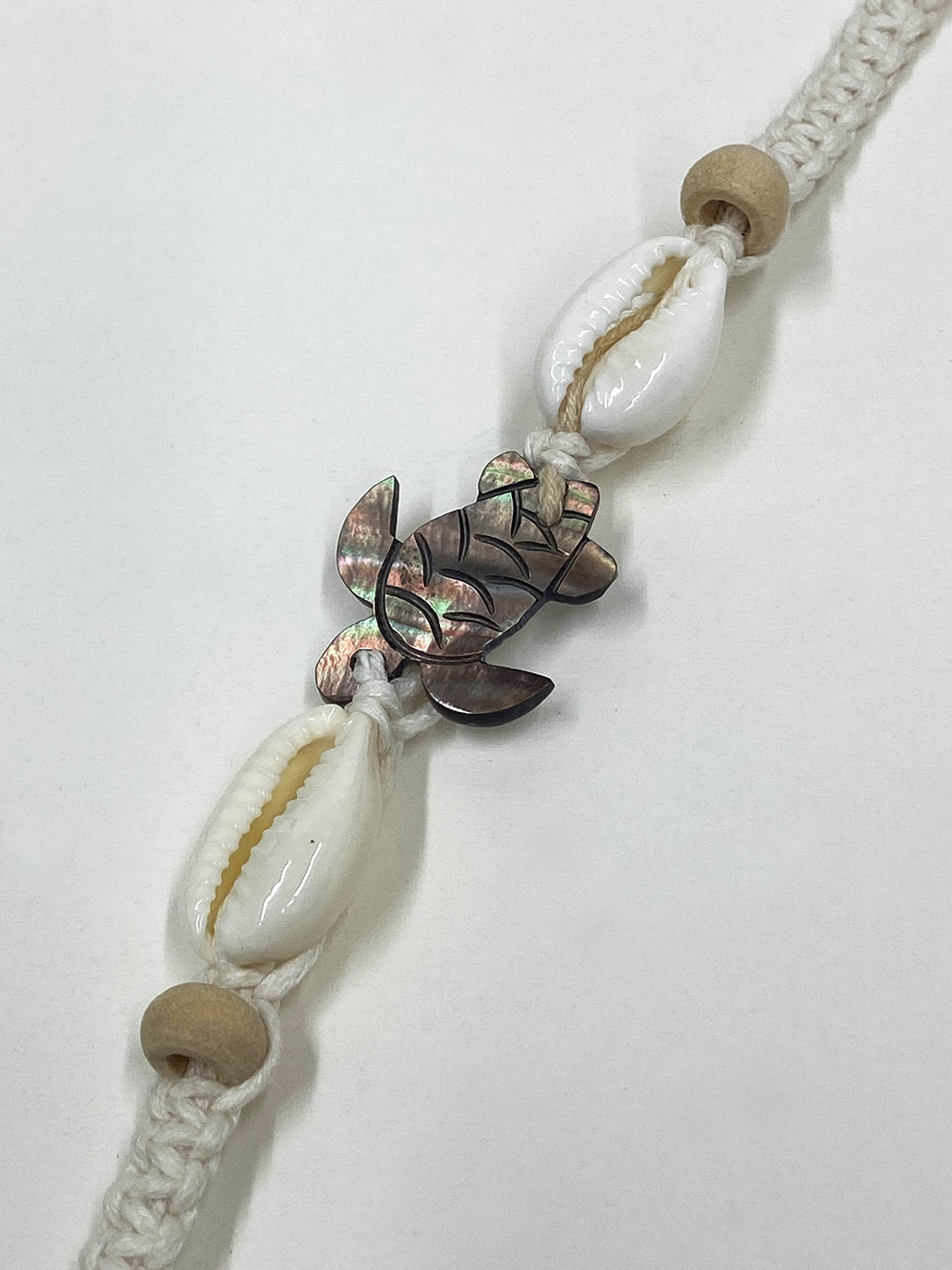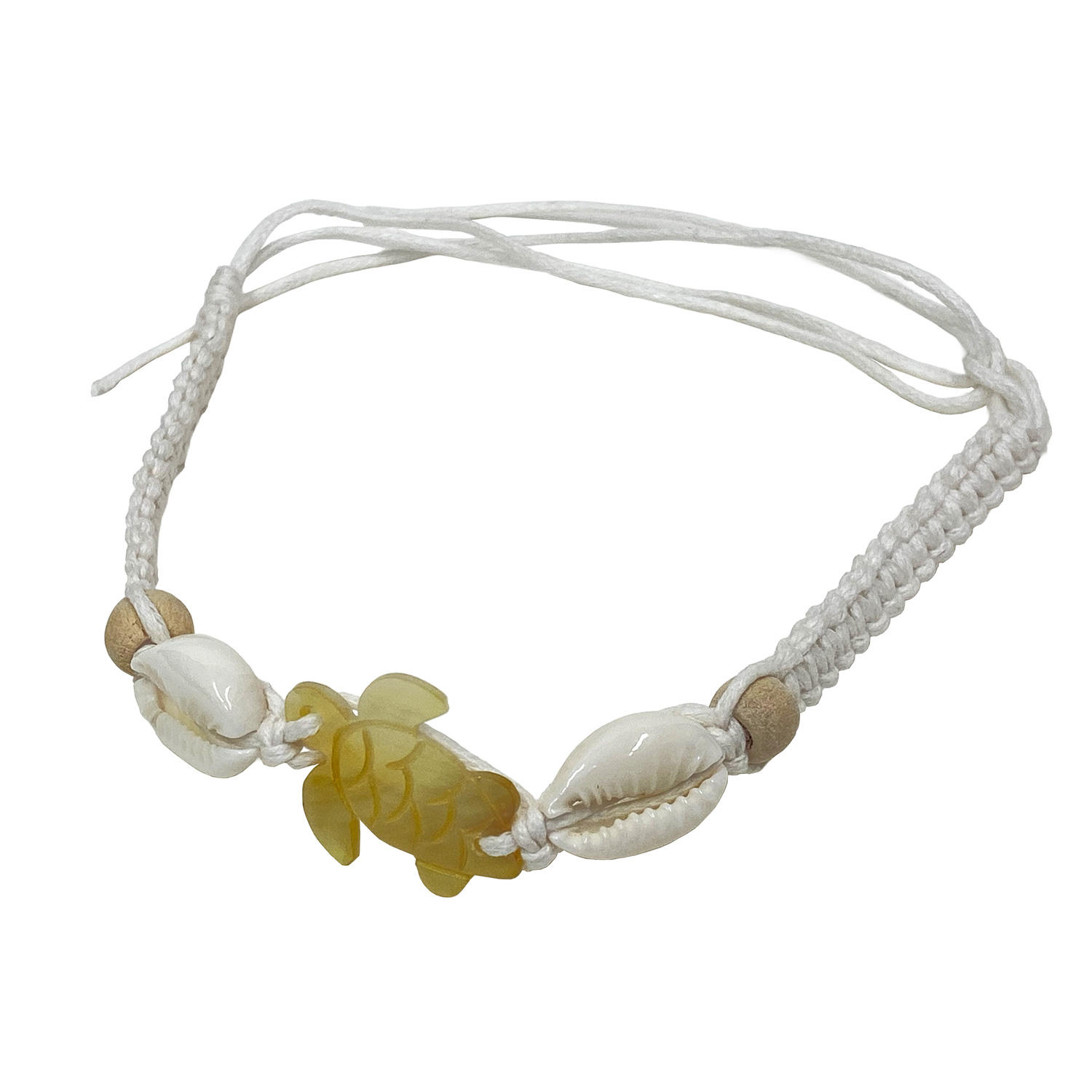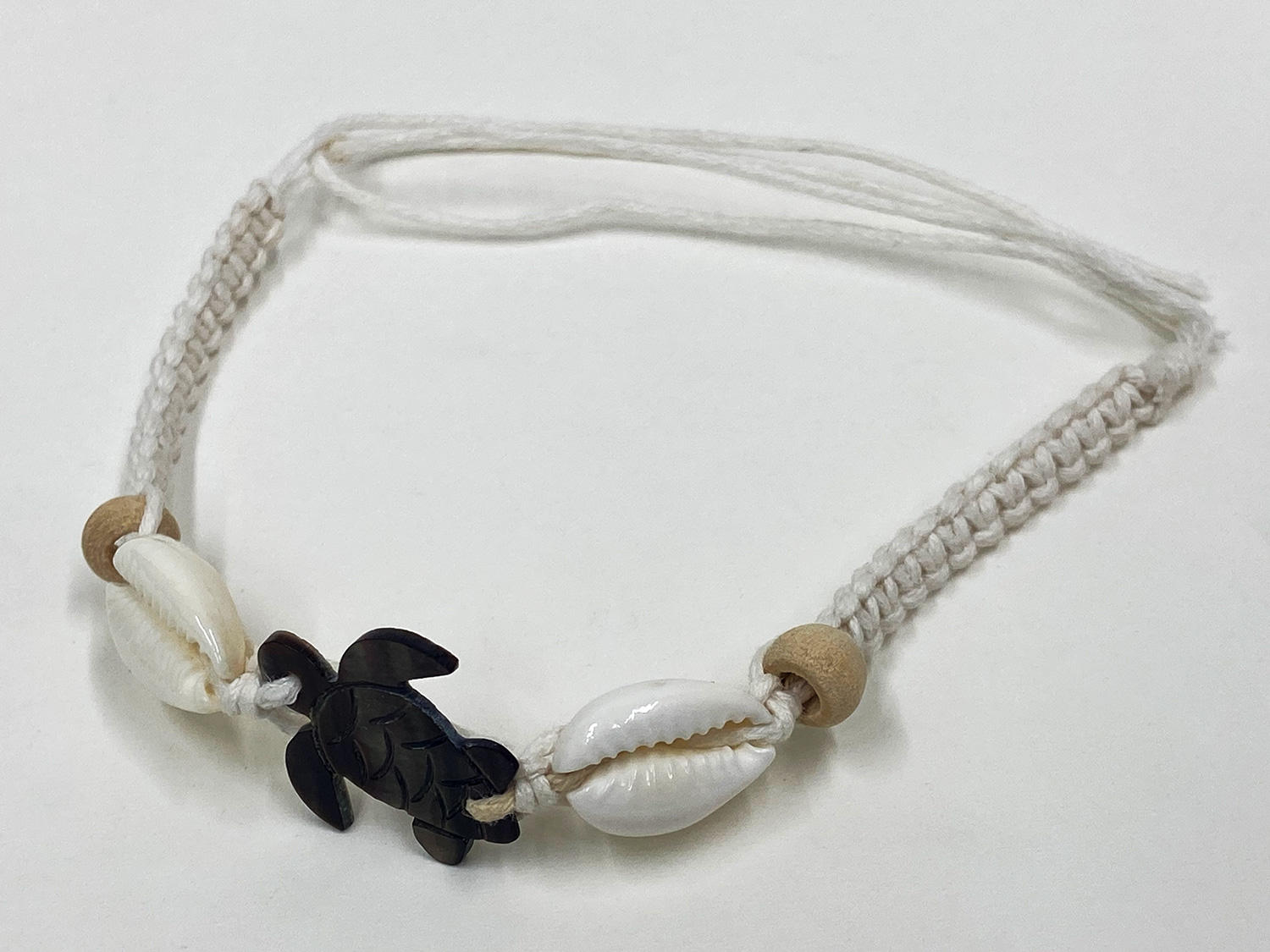 編みこみヒモとウッドビーズ+シェルで作った現地感たっぷりの編みこみアンクレットミサンガ ホヌシェル。