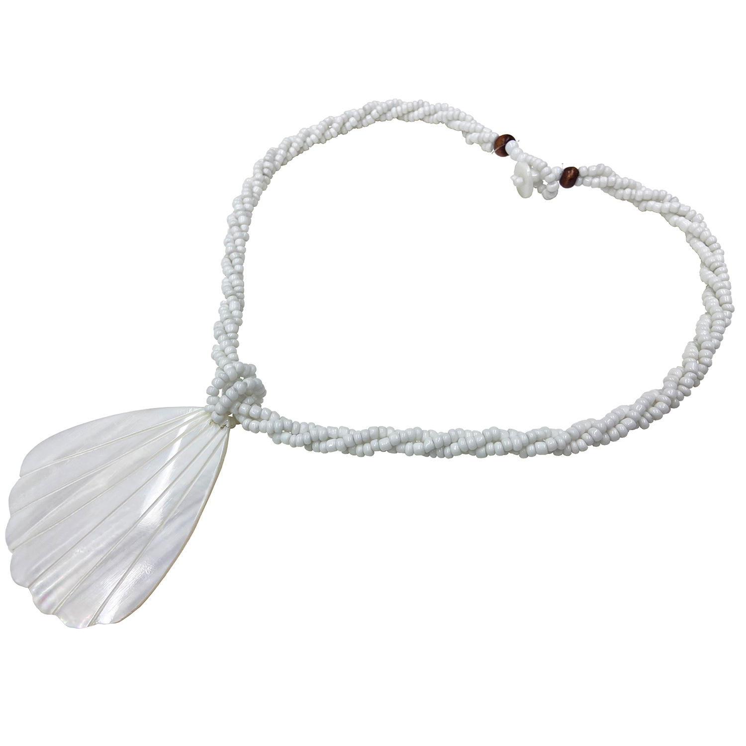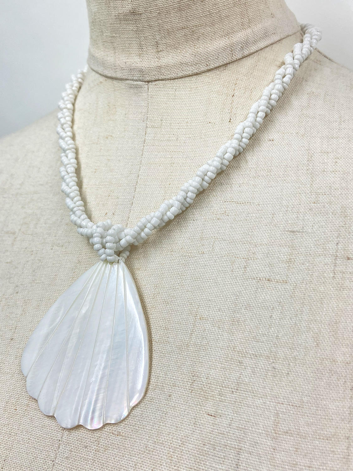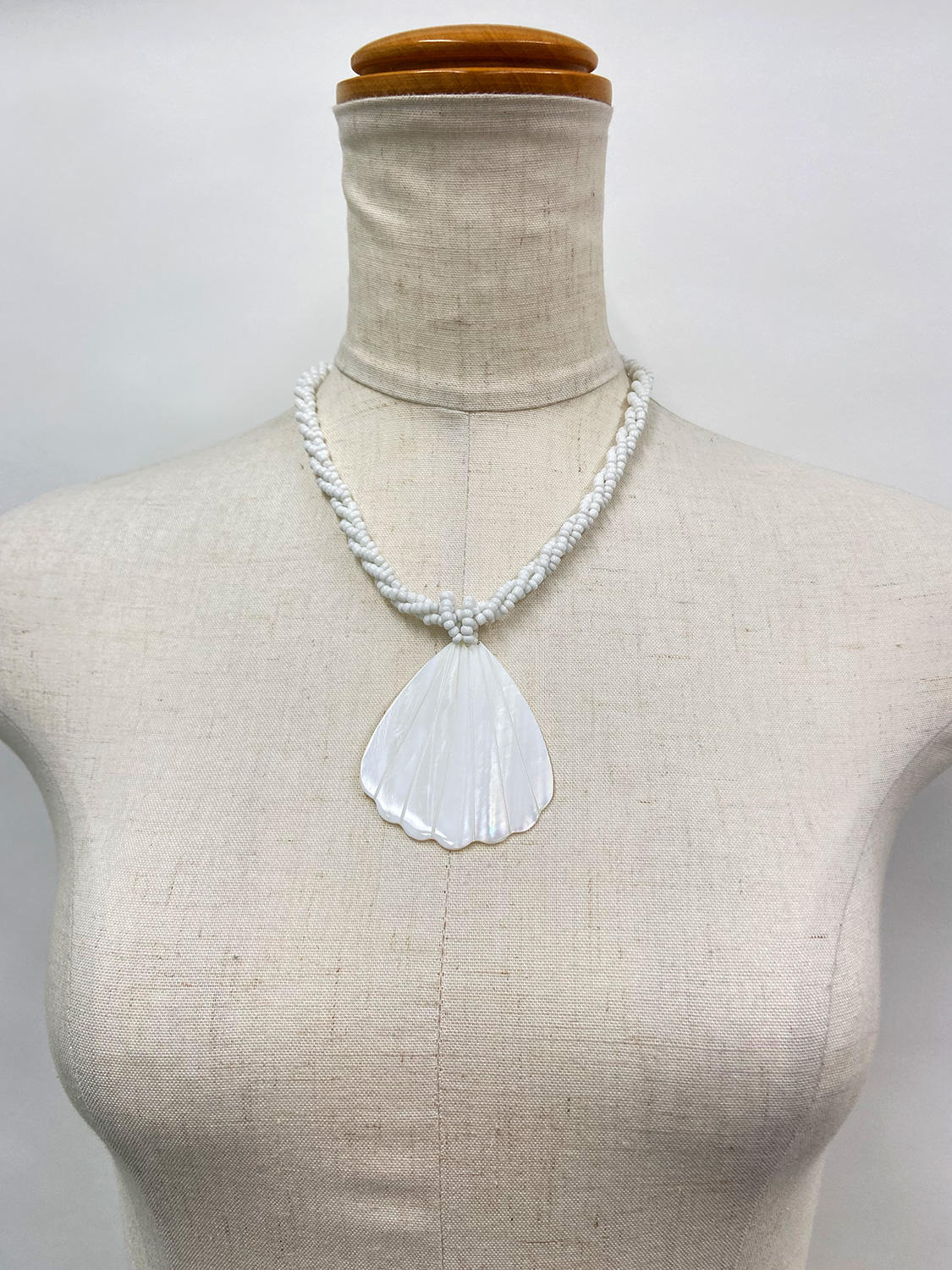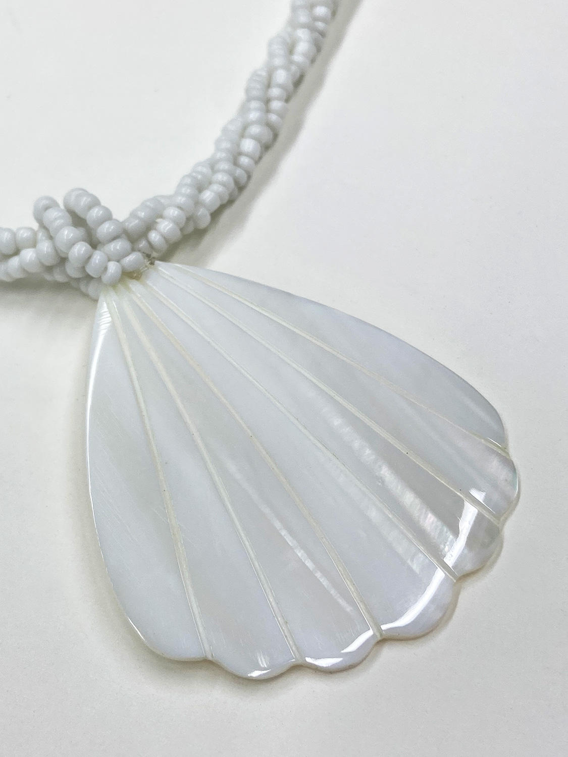純白ビーズを使用したシンプルでシックな真珠貝モチーフのネックレス。