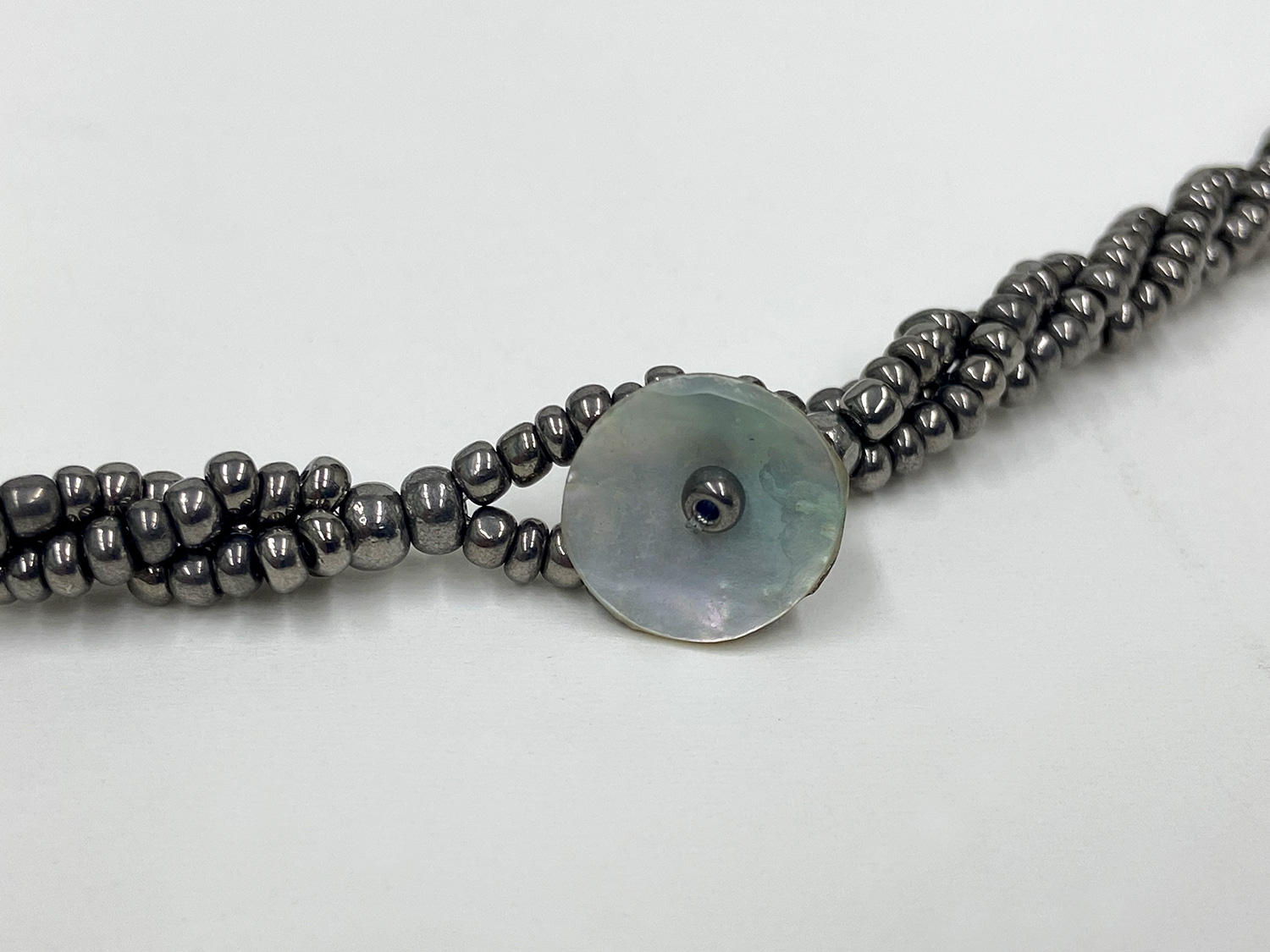 チェーン部分は数あるビーズの中から金属とも見紛うブラックシルバーのビーズをチョイス。