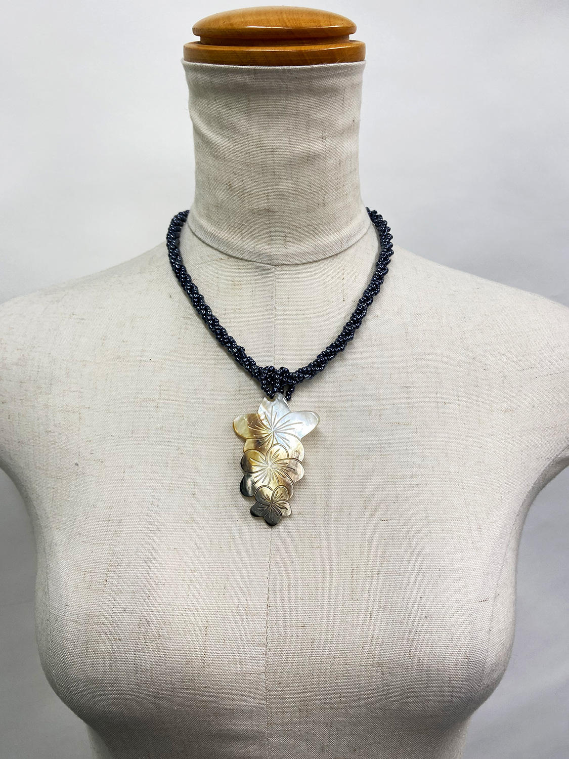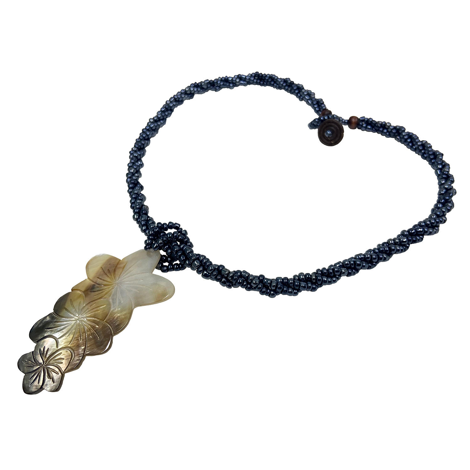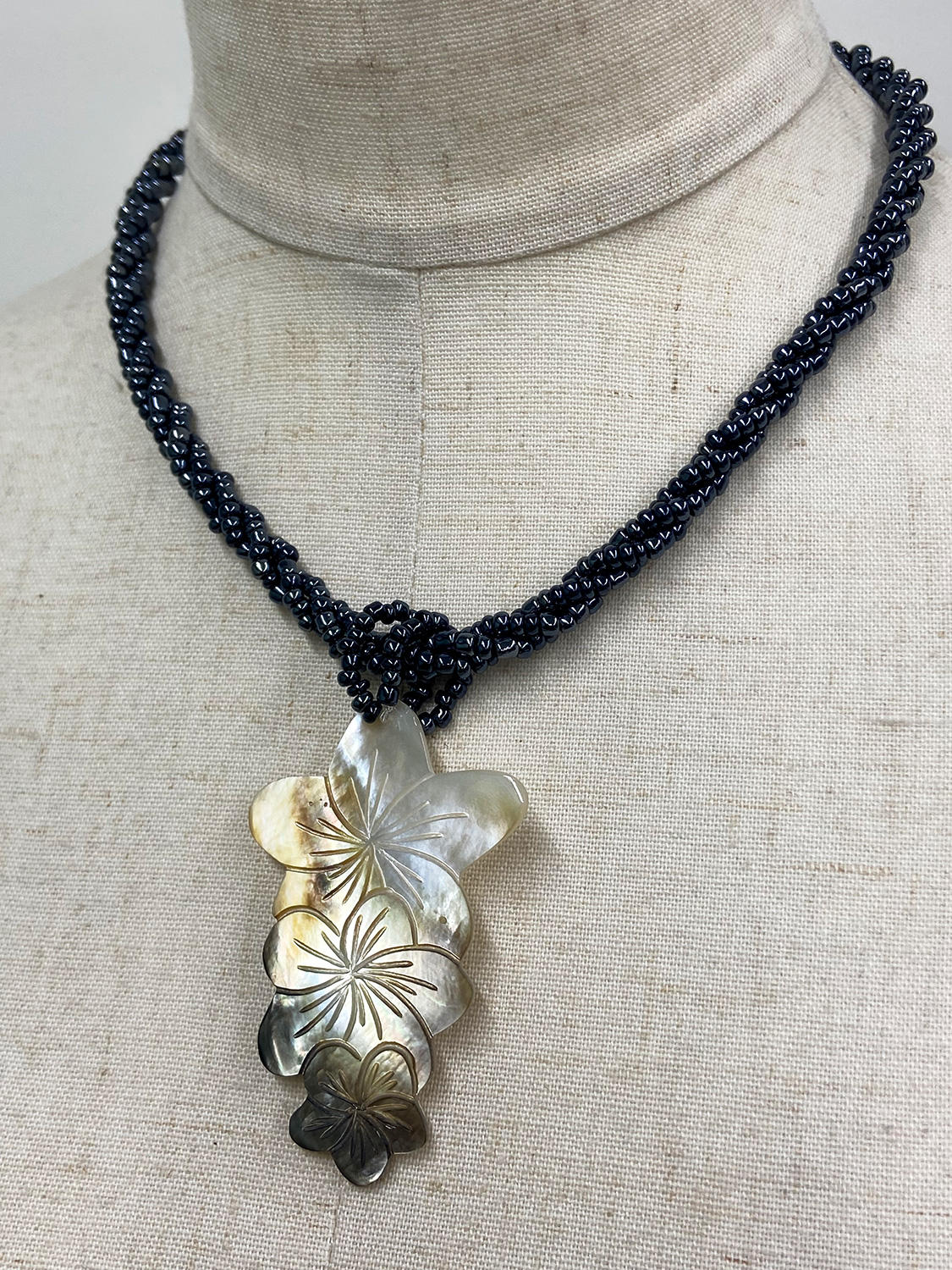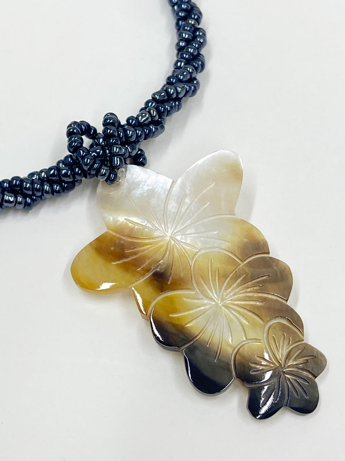 天然シェルを大中小3つのプルメリアの形に丁寧にカットし、表面に彫刻を施したいま注目の美デザイン。ブラックビーズも丁寧に編みあげてます♪