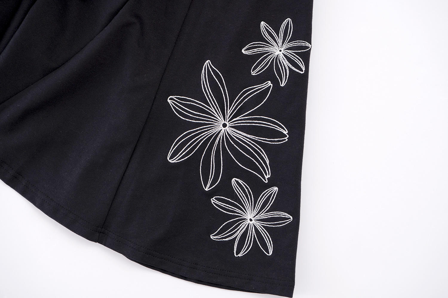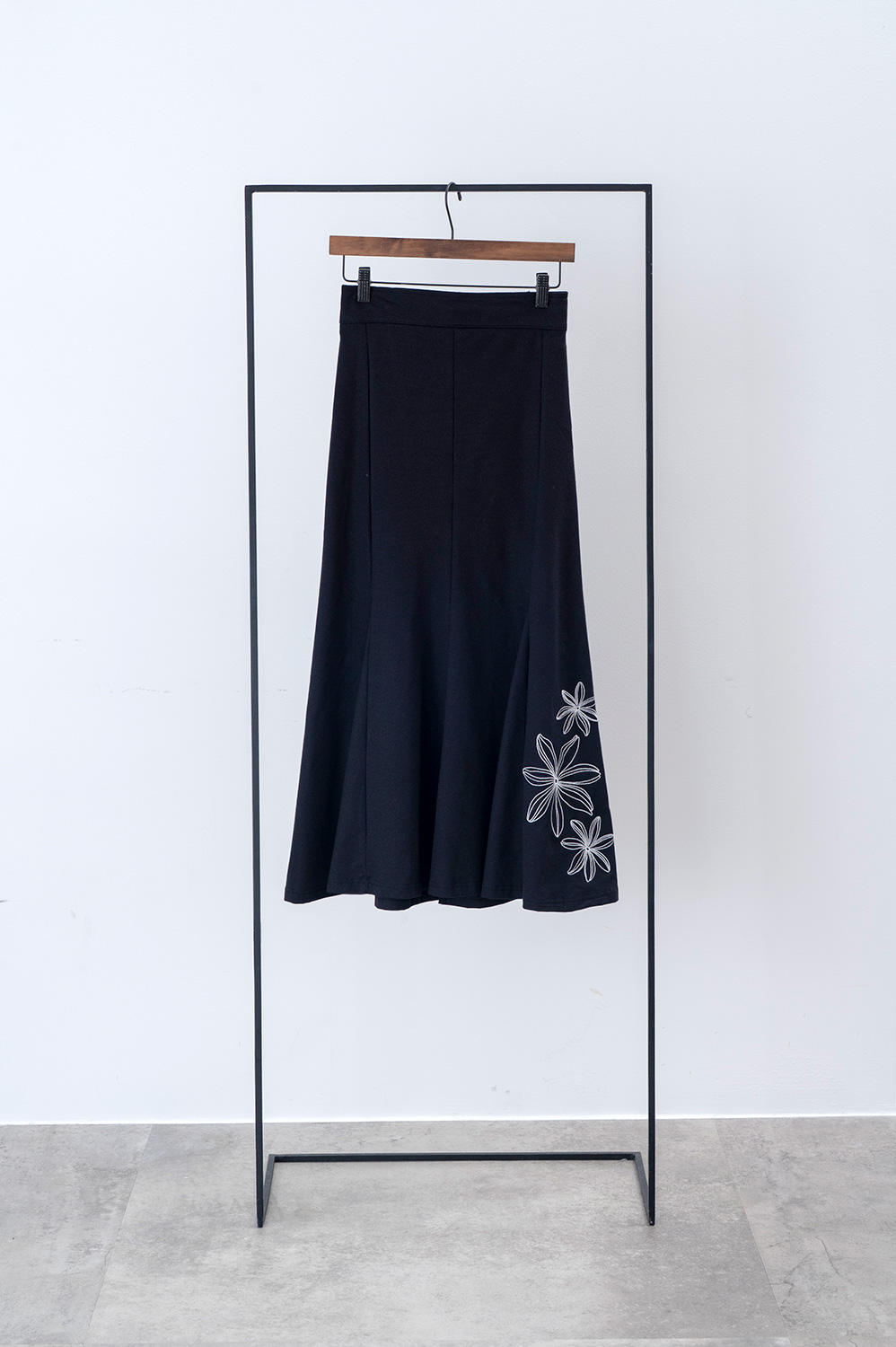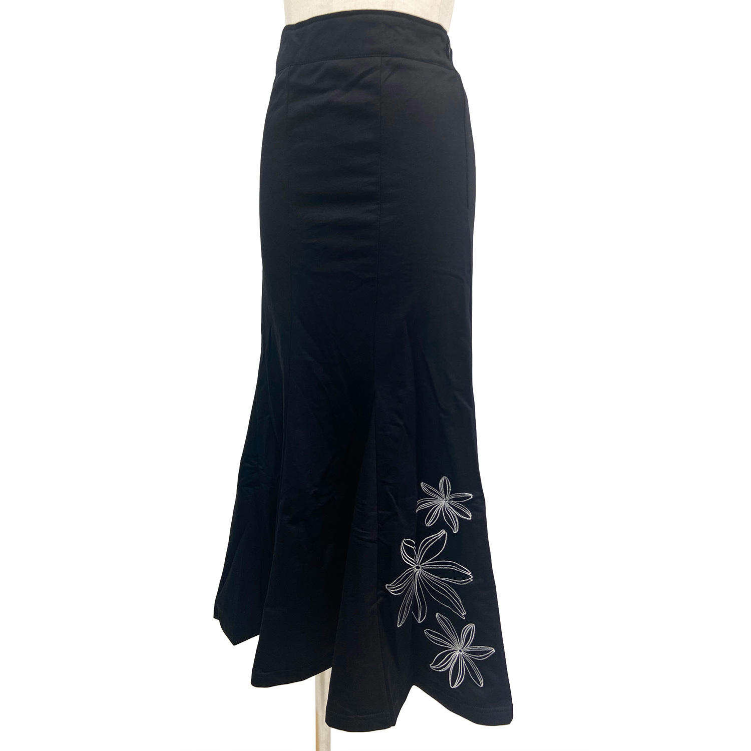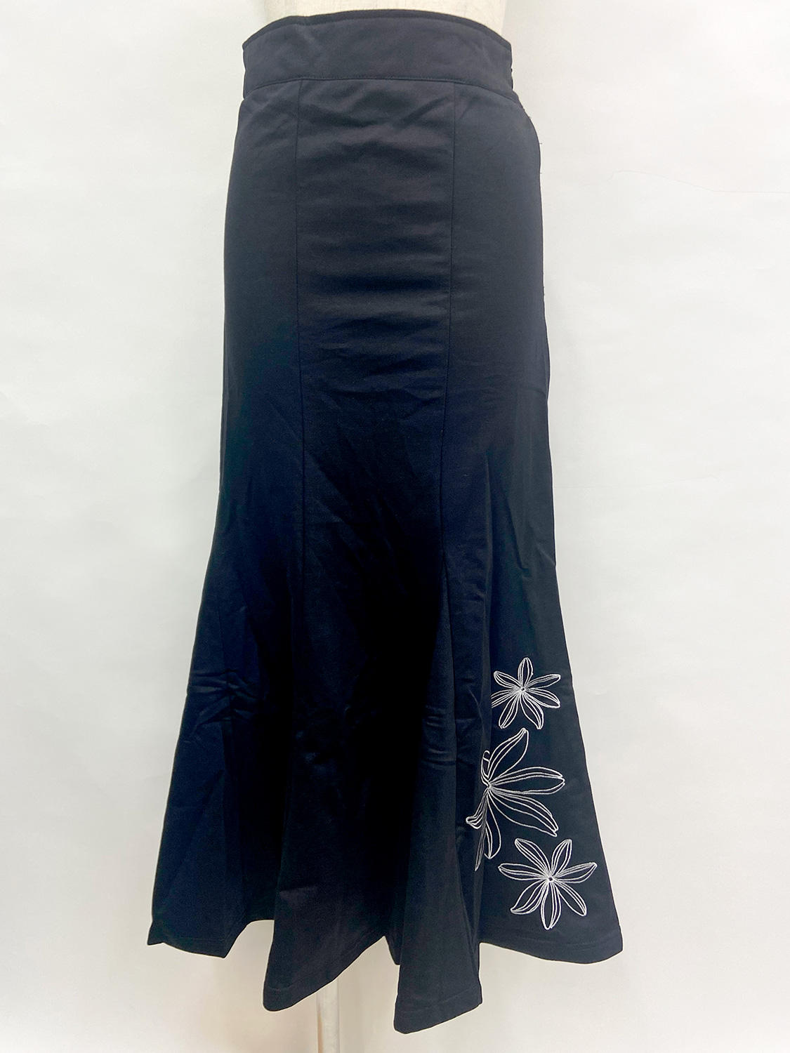 上品な刺繍が秀逸。ハワイアンでは稀少な裏毛マーメイドのフェミニンシルエット抜群なブラックスカートが完成。