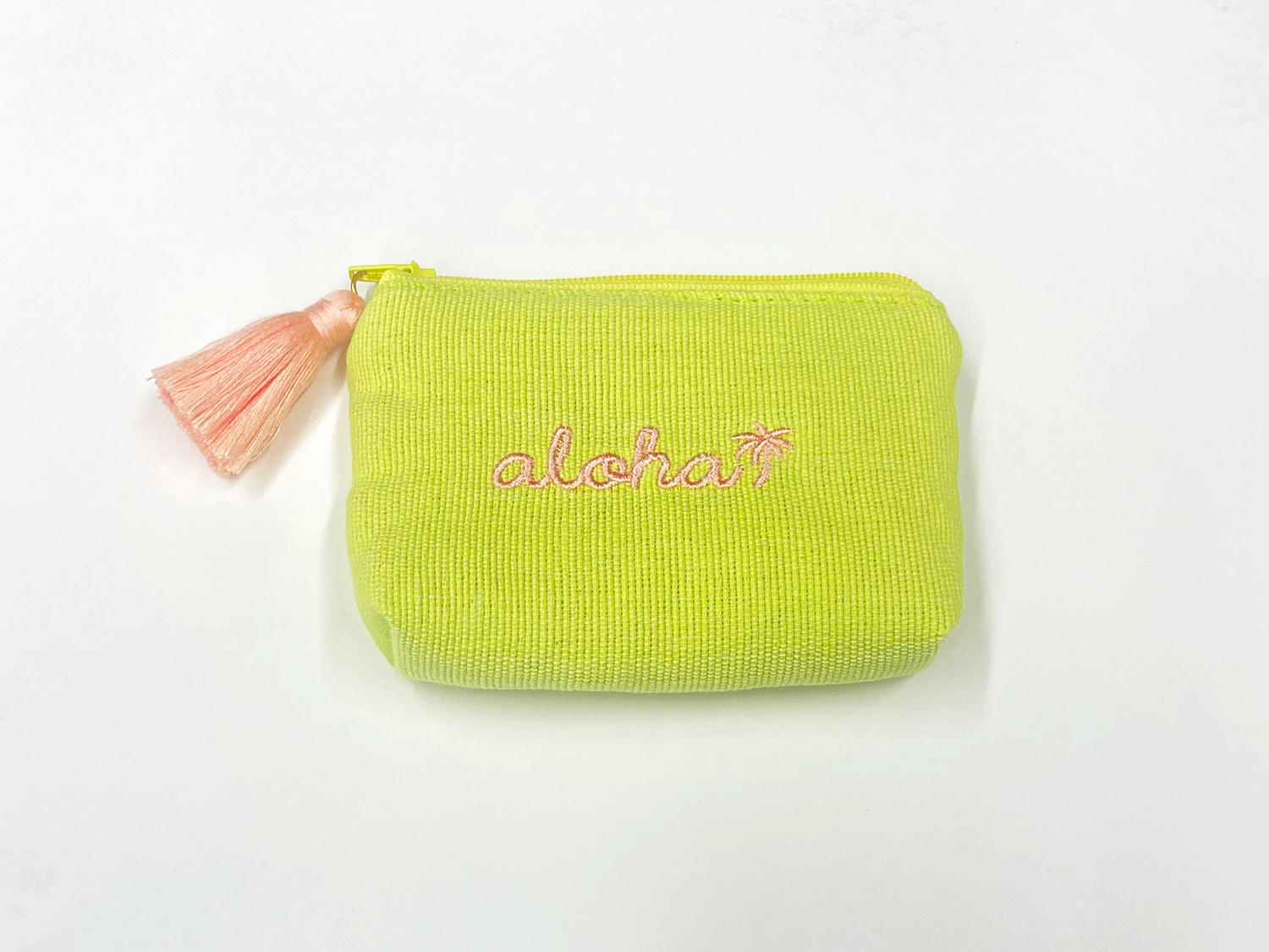 かわいいサイズ感のミニポーチ!このalohaイカット生地ポーチのデザイン、南国好きにはたまらない現地感あふれる雰囲気ですねー♪ライムイエローとピンクベージュの発色の良い組み合わせはほんと絶妙な可愛さですよね!