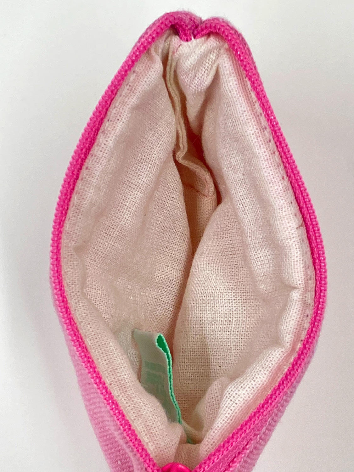 プチサイズのかわいいピンクカラーハワイアンポーチを、ふんわりと包み込むようなやわらかい肌ざわりのイカット生地で作りました