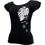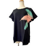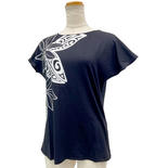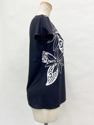 特にモノトーンな配色でシンプルに生地の右胸から肩ボディにかけてスタイリッシュに白でプリントされたティアレタパ柄はステキのひとことです。