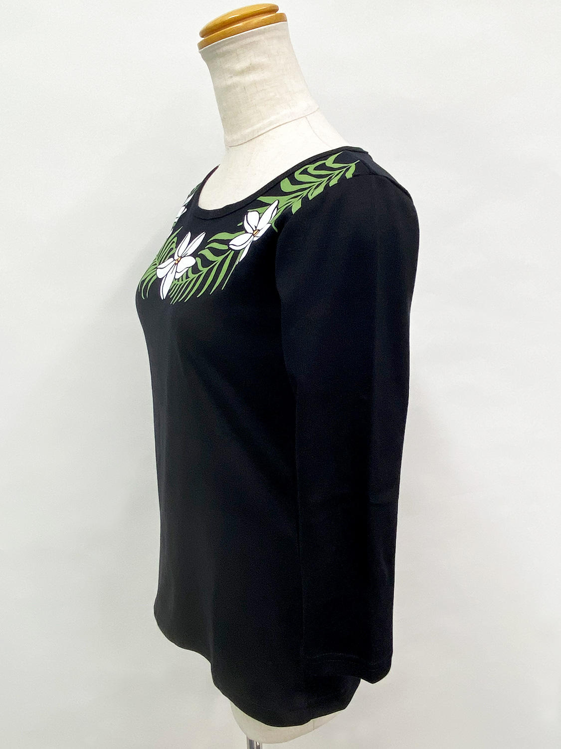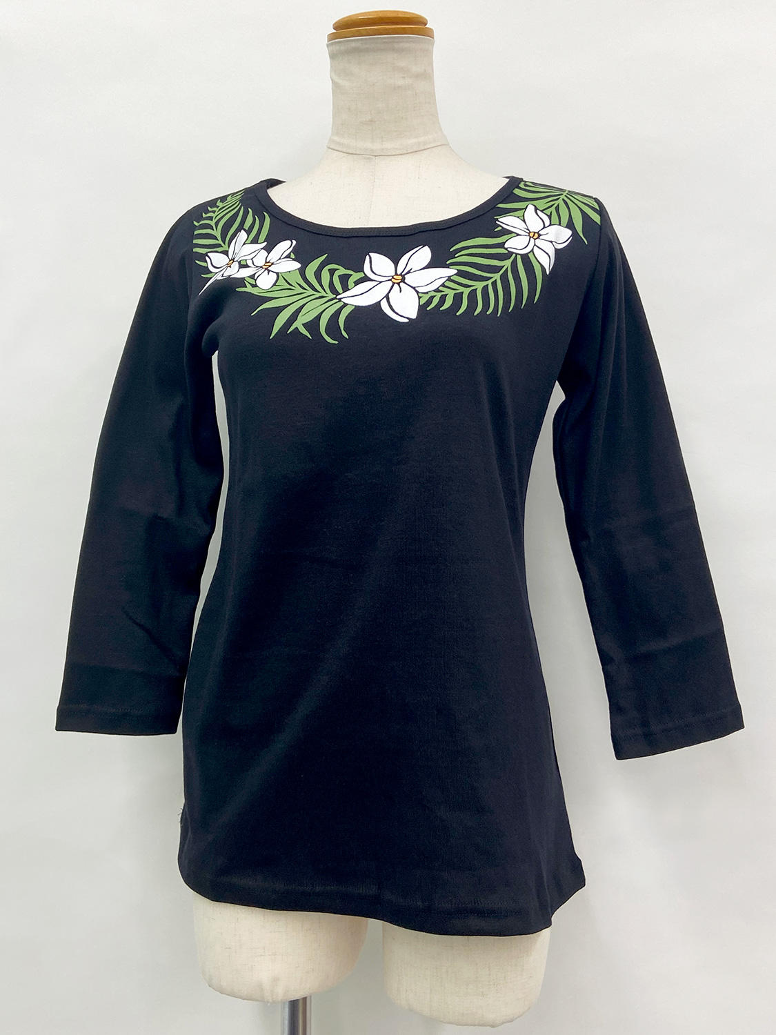 PUKANA 七分袖 ストレッチTシャツ プルメリアレイ ブラック
